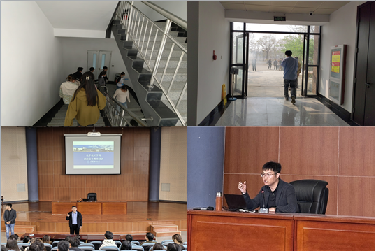 下午2时整,演练模拟实验室引发火灾,18号楼两侧门口燃起烟雾,四层五层楼道启动消防应急广播进行广播。听到广播后,四层五层各实验室师生以最快的速度从东西两侧楼梯有顺序地向楼下疏散。