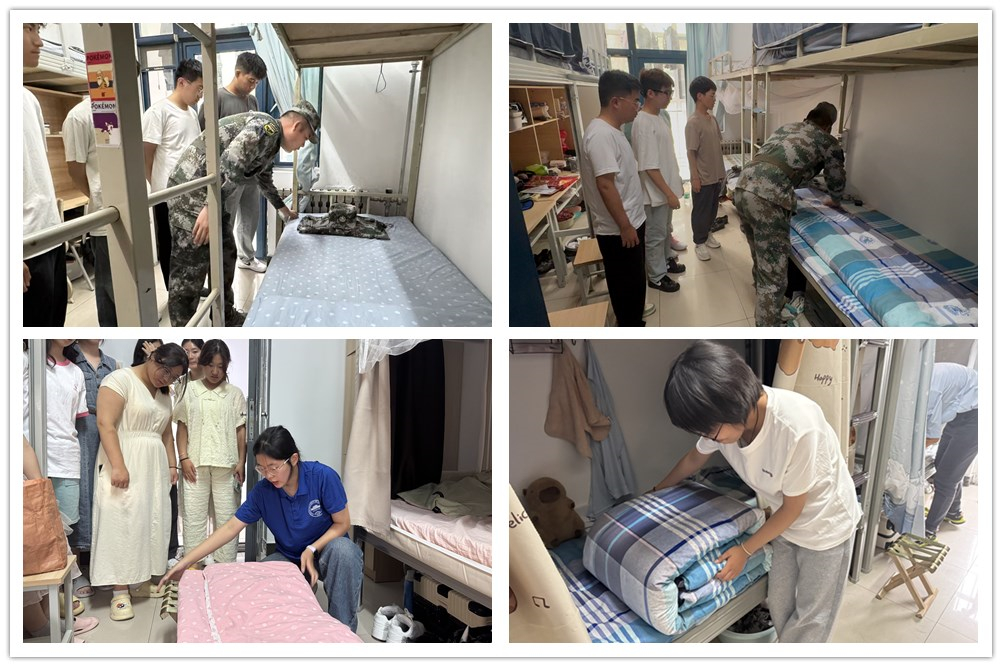 示范结束后,新生们积极投入练习:有的反复压实被子,有的互相协作整理床单和桌面。大家也在互帮互助中增进了友谊,增强了集体归属感。经过共同努力,宿舍面貌焕然一新。