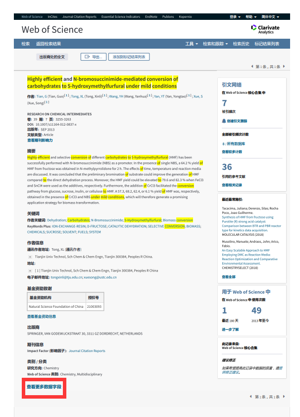 SCI论文的检索号又叫IDS号,由数字和字母组成,共5位,在论文检索页的最下面点击查看更多数据字段,在【其他信息】里出现,如下图所示