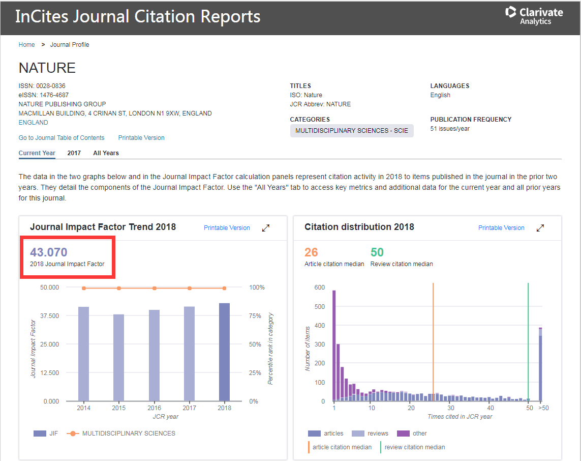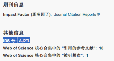 一般填写的是论文发表年度前一年,论文所在期刊的影响因子。在论文检索页下面的【期刊信息】里,点击Journal Citation Reports®链接,会出现如下的界面。也可进入网站http://apps.webofknowledge.com点击页面顶端菜单栏中【Journal Citation Reports】进入查询。