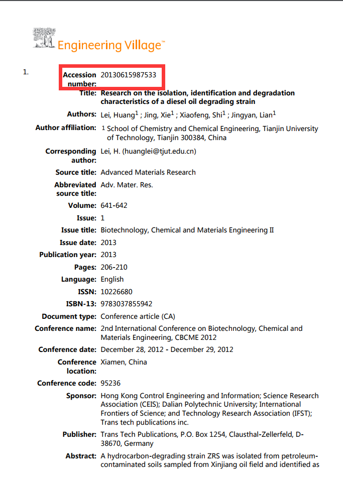 EI论文的检索号又叫Accession number,是一长串数字[20142017714344],在其检索页的第一行出现,需点开检索页的Detailed方能看见。