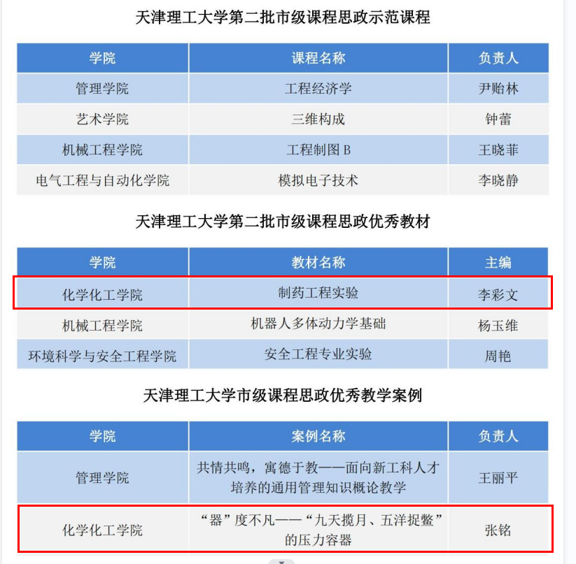 近日,天津市教委公布了第二批天津市级课程思政示范课程、课程思政优秀教材和首批天津市级课程思政优秀案例获奖名单,我院李彩文老师的《制药工程实验》获批天津市级课程思政优秀教材,张铭老师的《“器”度不凡--“九天揽月、五洋捉鳖”的压力容器》教学案例获批天津市级课程思政优秀教学案例。