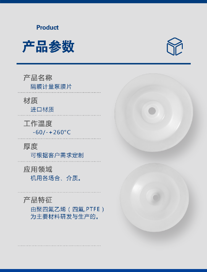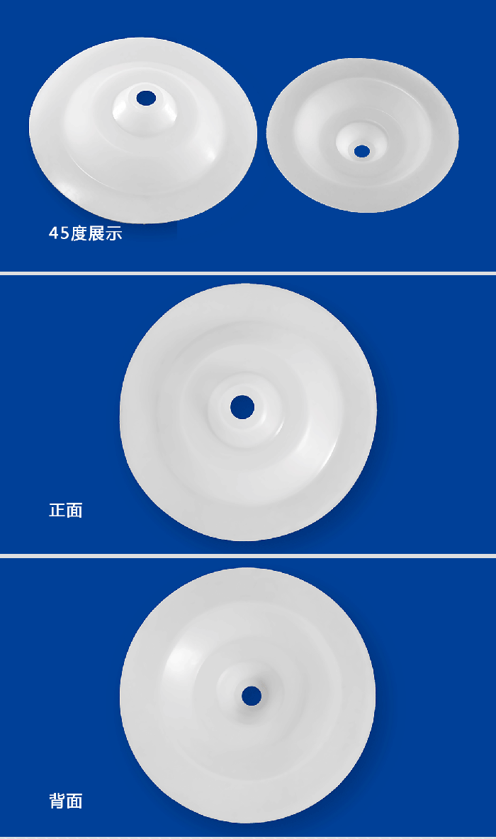 进口气动泵设备专用四氟膜片 - 此配件是由四氟(PTFE/聚四氟乙烯)材料研发生产而成的,用于泵类如气动隔膜泵、计量泵等,阀类,规格尺寸可定制!